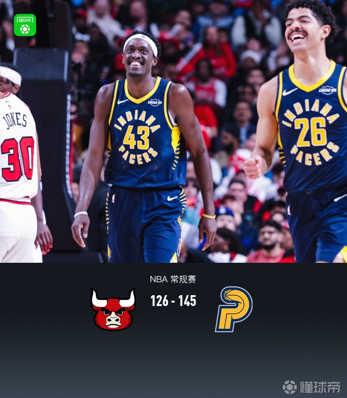 第四节公牛伦纳德-米勒拿下10分,步行者迈卡-波特拿下8分,最终公牛126-145不敌步行者